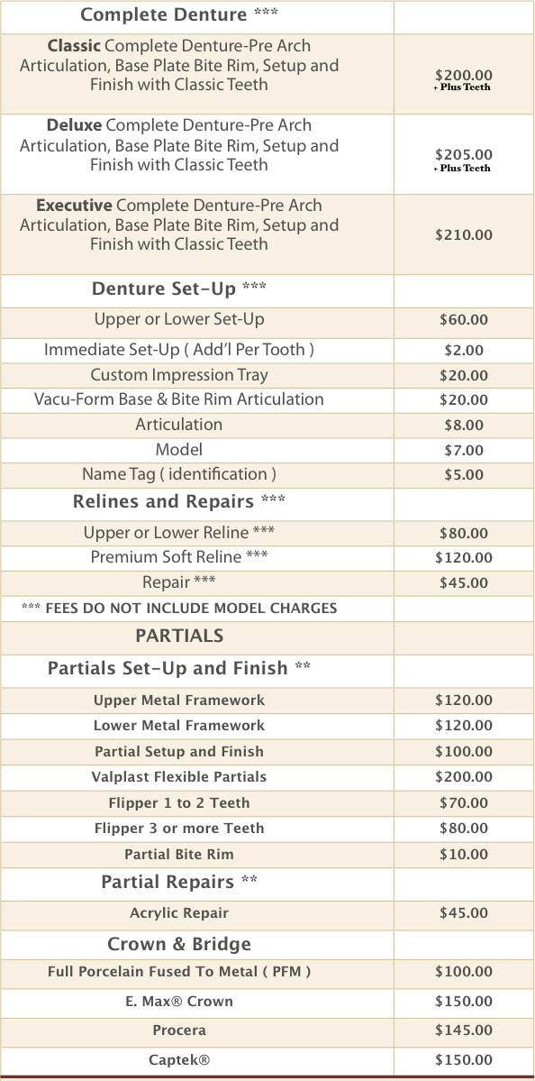 Prosthetic Price List